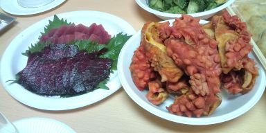 一昨日から一泊でいつもお世話になってる石巻の学校の合宿に参加させて頂きました。昼間カルテットの練習が合わせがあったので、今年は夕方からの参加。到着早々に目に飛込んで来たのは恒例の釣り用の巨大なクーラーボックスの山。当然中には飲み物等がこれでもか言う位入っており、強固な結束力を誇る親の会を物語っています。東京佼成の先生が合奏指導されますので、ワタスは木管分奏やまだ慣れてない1年生に吹けそうな部分を指導したりとサポート的な役目です。佼成の先生とも数年前からご一緒させて頂いてますが、"微に入り細を穿った"指導には毎回感服しております。自分だったら聴き逃す様な箇所を瞬時に見つけ出し、的確なアドバイスをされます。一応ワタスも仕事的な立場で行ってますが、実は自分も勉強させて頂いてる次第でございます。今年も色々と盗ませて頂きました。コソコソ(( ̄_|夜はご父兄との懇親会。沢山の食べ物・飲み物がある中、なんとクジラの刺身が鎮座しており、生姜と一緒に食うとたまらんです。他にも蒸しホヤ、へそホヤとホヤ三昧。さすがは石巻!!。たっぷりと堪能させて頂きました。肝心の演奏はと言うと、合宿の総仕上げとして最後に通した所、グッとこみ上げて来る箇所が多々あり、ちょっとヤバかった。本番でも聴衆をグッとさせる様な演奏出来るといいですね。