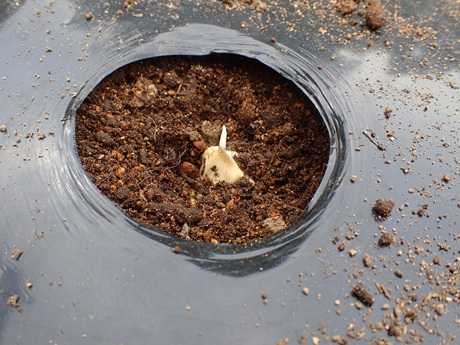 1片ずつに分けた種ニンニクの芽を上に(先のとがった方)して、