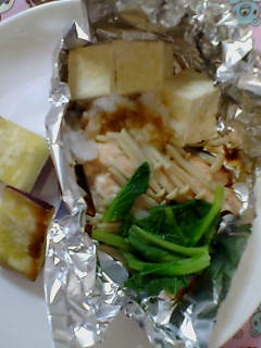 酒、塩、コショウで下味をつけた鮭、水切りした豆腐、エノキをアルミホイルで包んで蒸し焼きにして、焼けたら大根おろしと青菜を添えてポン酢を適量。ハル用には大根おろしとポン酢の代わりに仕上げにとろけるチーズをひとつまみちょっと鍋料理みたいな感じでさらりと平らげた