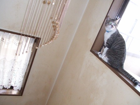昨日 パソコンに向かっていると ニャンタの助けを求める泣き声が・・・(助けを求めるときの泣き声は 情けないけど悲痛な叫び声になるんです)何故と思い 探してみることに・・・部屋を出て 階段を下りようとしたその目先に・・・いましたっなんで そんな所に・・・どうやって・・・普通に窓のそばにいるようにみえますが・・・実はえらいことにきっと 階段の手すりをかけのぼって ジャンプして あの場所へとたどり着いたんだと思います・・・ただ 降りようと思っても 確かな足場はなく そこは2階・・・手すりにジャンプしても ななめの手すりから落ちる可能性は大・・・しかも ジャンプするにも 助走がないので 手すりにたどり着く前に落ちる可能性ではなく きっと確実に落ちる・・・それが わかっているので 動かずに助けを求めていたのである動かないだけましだと思って 脚立をかけると そこを渡って無事に生還いたしました足早に 自分の定位置に戻り ばつが悪そうに寝たふりです