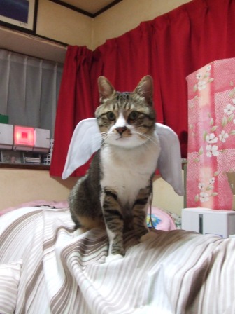 今日は 月に1度 家にお寺さんからお参りに来る日だったので どこにも行かずに家にいることに・・・とはいっても お昼過ぎには帰られるので その後は何もすることはない・・・ゴールデンウィーク中の暇なときに見ようと 見たくてたまらなかったDVDをレンタルしにいくことにしたそこのレンタル屋さんは 100均と同じ店舗になっている何かないかなぁ~~~と物色していると 変装グッズが並んでいた・・・ニヤリ早速 購入ニャンタの変装ですかわいい かわいい ニャンタ天使です何か お願い事があれば ニャンタ天使にどうぞただし ネコですので きまぐれですご理解をお願いします・・・なんてね