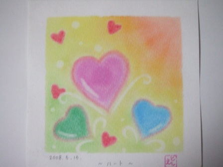 前回の 練習の為の和歌山滞在でしたが 妹からの依頼もあり パステルアートの画材一式も 持って行くことに・・・前から ずっとやりたい・・・やりたい・・・と ぼやいていたので やっと静かになるわ と一安心早速 着いたその日の晩から 妹の旦那のいとこも加わり 描くことに・・・夜遅くに始めたこともあって 私は1枚しか描けませんでしたが 妹は初めてのはずなのに 何枚も描いていくのですもうそろそろ・・・と切り上げて 寝ました そして 翌日は 妹のお友達も一緒に描くことに・・・お友達にも 楽しく描いてもらい 家に帰って子供達に見せたとの事ですその翌日も 妹のお友達と描きましたみんな 楽しんでいて はまりそうな感じでしたその中でも 一番はまっているのは 妹なんですけどね・・・私は 合計8枚描いたのですが 妹は 数え切れないほど描いていましたねそんなこんなで 妹の絵を写真にとってくるべきだったと ブログにかいている今 後悔しております私だけの絵になりますが みてやってくださいハートです新しい命ですこれを一緒に描いているときのお友達は妊婦さんだったのです春の陽射しです水面の満月です以上 4点 ご紹介しました結局 パステルの画材は すべて妹の家にまだありますきっと 楽しんで描いているはずです