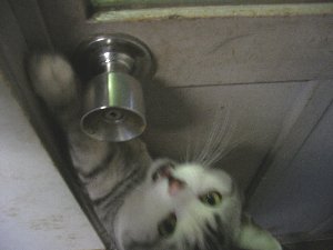 どうしても仕事が忙しい時は、タマを事務所に入れておきます。すると・・・ ↓必至で外に出ようとしてます。タマ、すまん。外が見たい気持ちはわかるが、ちょっと今忙しいので勘弁してください。。。終わったら出してやるからさ・・・