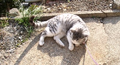 久々に暖かかったので、少しだけ外に出してあげることに。 ↑ 紐付きです。天気予報じゃ明日からまた寒くなるようなこと言ってるしさ。しかし、外に出ると必ず地面に体をこすりつけて、体中泥だらけにしてきます。 ↓絶対やるんだよね、ネコって。なんかこう、「ゴロにゃ~!」 って感じで・・・ 何でかな?