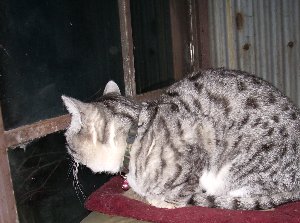 外は真っ暗です。何も見えません。 夜だから。なのに・・・ ↓ただ一点を見据えるタマ。タマ、オマエには何かが見えるのか?ネコは目がいいっていうけど、こんなに真っ暗でもホントに見えてるのか・・・っつうかその前に、外には何にもないっつうの。