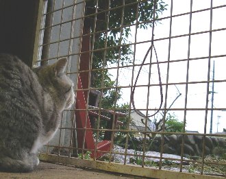 いかにも、今日は雨か・・・という雰囲気を漂わせてたので、「まぁ、小降りくらいならええか。」と思い、少し外に出してやろうとしたら、・・・!・・・っと、突然止まって引き返してきました。まさか地面が濡れてるのに気が付かなかったのか・・・それとも雨に濡れるのは初めてだったのか・・・これから雨の日は大人しくしてましょう。