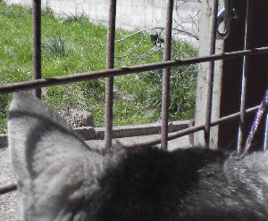 最近よく来るんです。。。ヤツが。 ↓また来たよ。。。よっぽどコッチが気になるのか・・・それともただの散歩コースか・・・(どっち見とるんやて、タマ・・・)