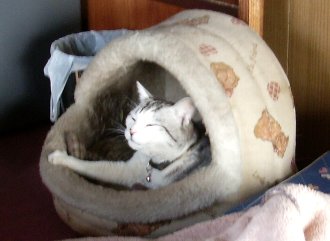最近、暖かくなってきたせいか昼間はよくココにいます。 ↓前が開けているベッド。 なんちゅう顔や・・・冬の間は寒いから、 ↓かまくらタイプの家にいるんだけど、今コレはちょっと暑いか・・・片付けよ。。。