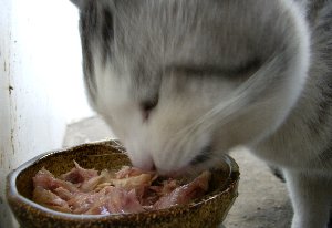 最近のタマのお気に入りネコ缶ですが、ホントに美味いらしくて、よく食うんだけど・・・壁際の方が、口が届かないらしく、いつも残してあります。で、↓クルッとひっくり返して、こうしてあげないと食べれないようです。器が深すぎるのかなぁ?でも浅いとこぼすしね。。。
