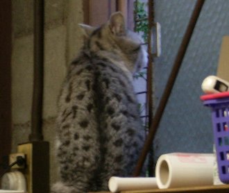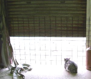 いつも同じ景色ではつまらないと思い、最近は表のシャッターを少し開けて、そこに柵をして違う景色を見せてあげています。前はいろんな人や車が通るので楽しいのか、じっとしています。そう・・・ただ、じっと一点を見つめて・・・(っつうか見すぎ)置き物か・・・