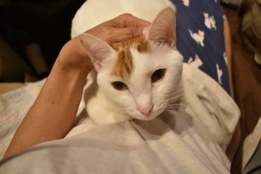 抱っこされるのは大嫌い、膝の上にも乗ってこない。でも、スリスリとママにだけ思いっきり甘えます。匂いに敏感で、ちょっと神経質かな?