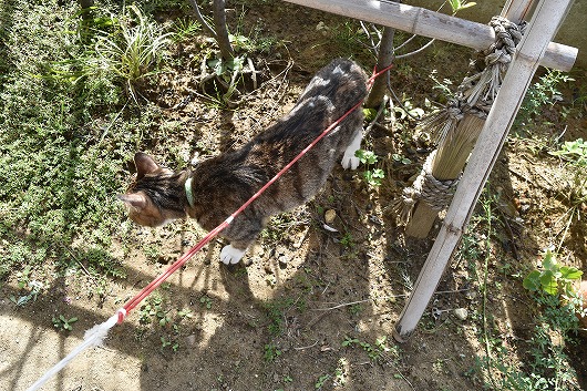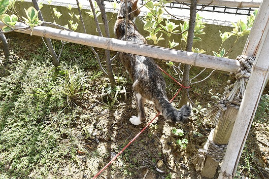 葉っぱを探し回っていると、リードが巻きついちゃって、