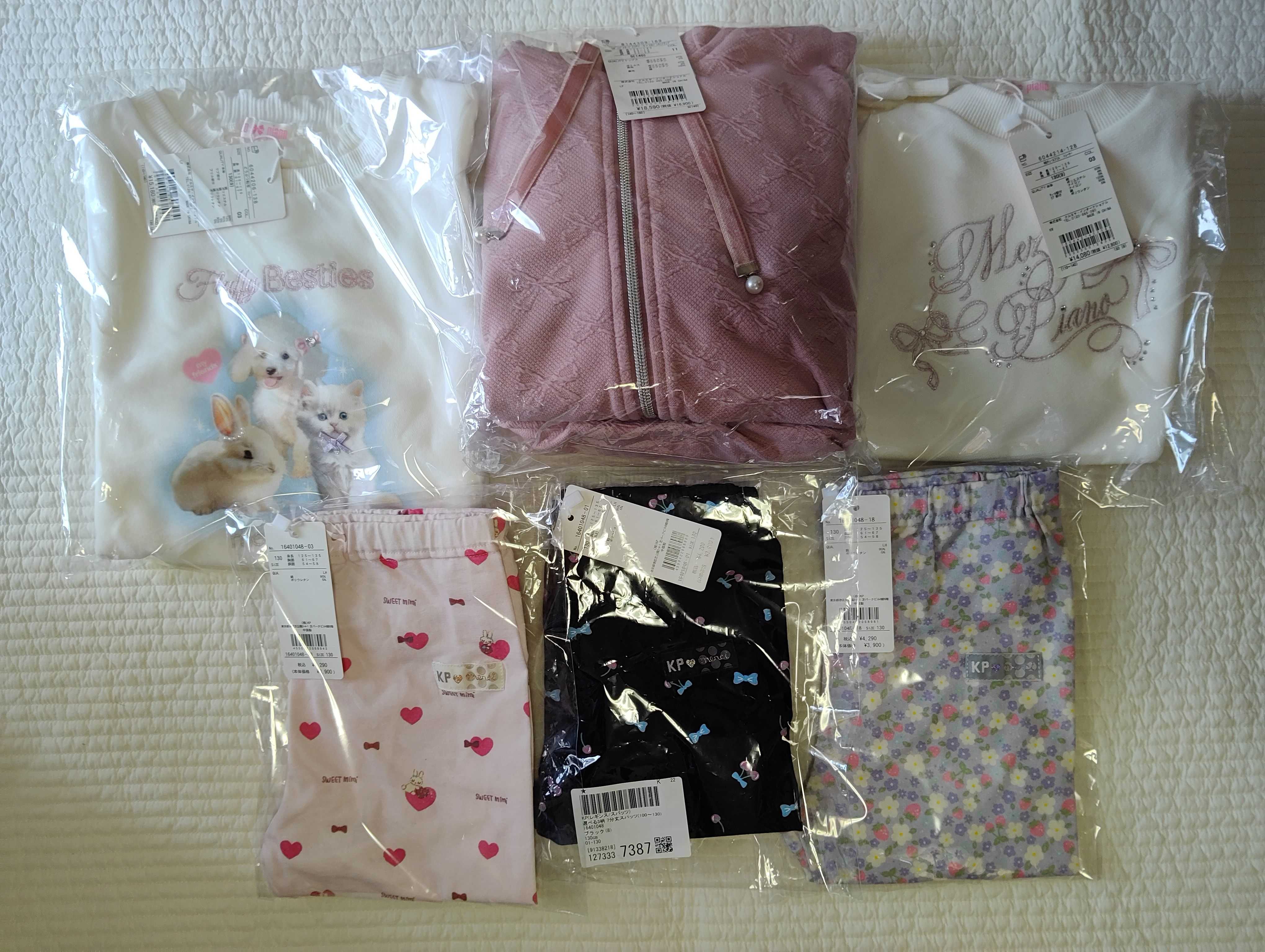 こんにちはー。暑いですね。すっかりセールのこと忘れてましたが、皆様方のおかげで欲しいもの購入できました。早速届いてます。こちら。KPのレギンスは90の頃からずーーーっと買い続けてます。半額でゲットできました!KPのTシャツに合わせるとほんとに可愛いんですよねー。買えてよかったー。そしてメゾです。トレーナーアフィこれかな??メゾピアノ(mezzo piano)袖チュールフリル トレーナー実物のが可愛い!どうぶつ転写トレーナーメゾピアノ(mezzo piano)どうぶつ転写 トレーナーメゾピアノジュニア リボンジャガード セットアップはピンクにしました。くすみピンクで可愛い!!リボンの柄も高級感が♪こちらは140にしたのでしばらく寝かせます。メゾピアノジュニア(mezzo piano junior)リボンジャカードZIPパーカ×スカパンセットアップ当ブログはアフィリエイト広告を利用してます。