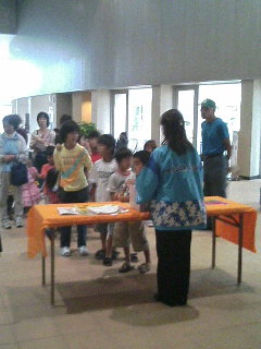 昨夜から、振り出した雨。。イベントをやる身にとっては、うっとしいもんです。(汗) でも、、朝礼で言ったんです。「これだけ雨が降ってると、お客さんは減ると思います。 でも、この雨の中を押して来られる方もおられます。 いつも以上に、笑顔で行きましょう!」 こんな事も、言いました。「雨が降ると、一度来られたら、ゆっくりされます。 滞在時間が増えます。ゆっくりお話を伺えます。 そういう意味で、雨に感謝します!」 雨が降る中、始まりました。小さいお子さんが、お菓子のつかみ取りに、並ばれます。みんな、うれしそうです。。 アリスは、今日も大人気です。小さなお子さんが、たかってます。。(笑) でも、各回、40個なんで、41人目の子供が、泣いちゃった。。(悲) 次回まで、待ってね。。 すぐに作れないの。。(泣) 今日は、バルーンショーもあります。細長い風船で、どんなものでもお姉さんが作ってくれます。 もらった子供は、うれしそうです。 料理実演もありました。会場内に、いい匂いが、たちこめてます。クリームワッフルなんです。 わたしも、食べたかった。。(笑) 一日、雨だったから、みんな、ゆっくりされてます。。 言ったとおりでしょ。。(笑)雨の日は、ゆっくりできるんです。 でも、、 人気のコーナーは、混んでいました。。(苦笑) いよいよ、明日限りです。 もう、最後です。忘れたら、後悔しますよ。。(笑) お待ちしていまーす!!