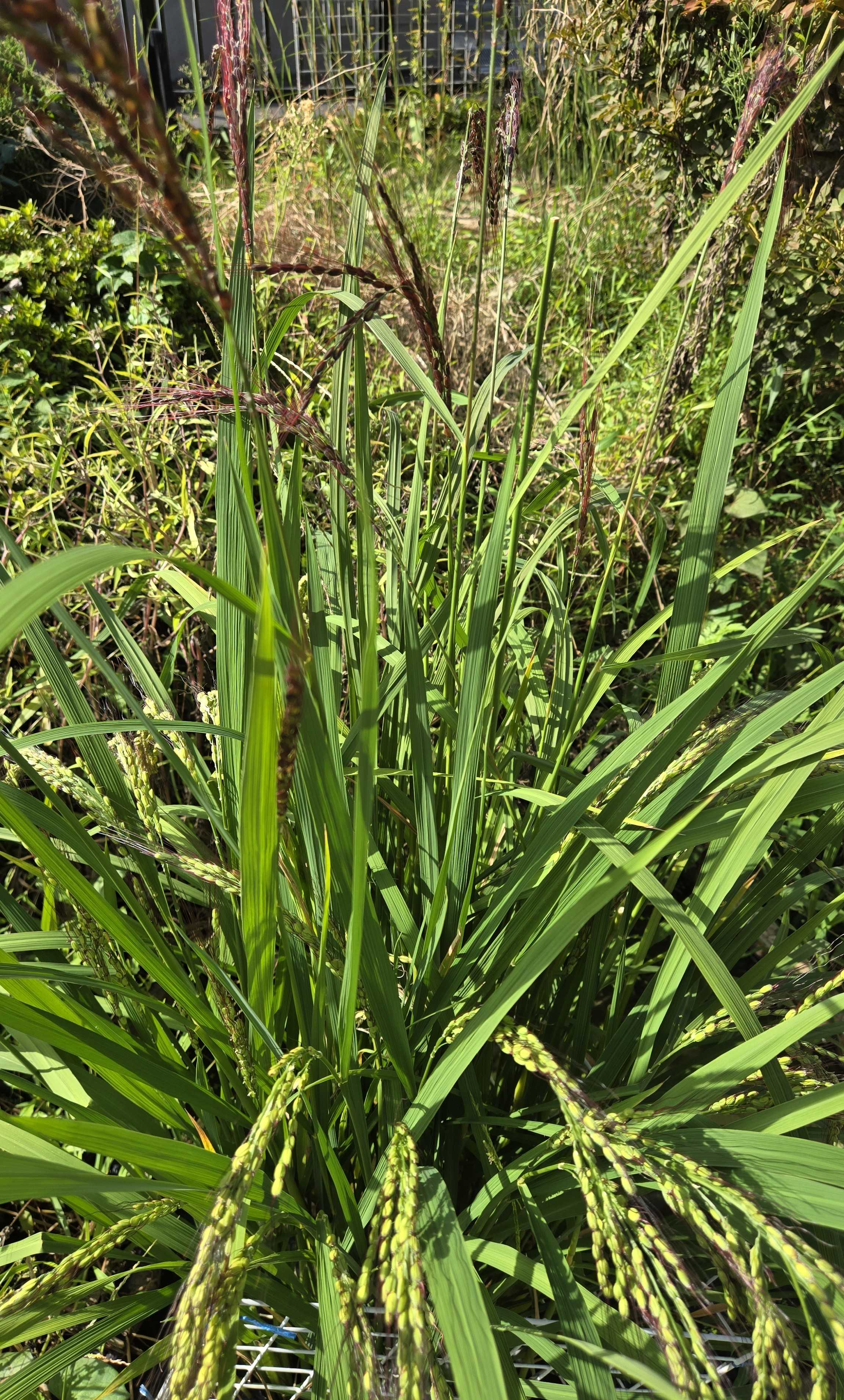 実家の庭のビオトープで育った古代米去年の神丹穂(かんにほ)だったはずなのですが9月になってググッと株が大きくなったと思ってたら別の赤米紅ロマンがくっついて育ってたようで一株のように見えて2種類の穂が実ってます。奥が神丹穂、手前が紅ロマン他に黒米も少し離れて実り始めました。今年は田んぼを借りてなかったのですがビオトープでも3種類、育ちました。にほんブログ村