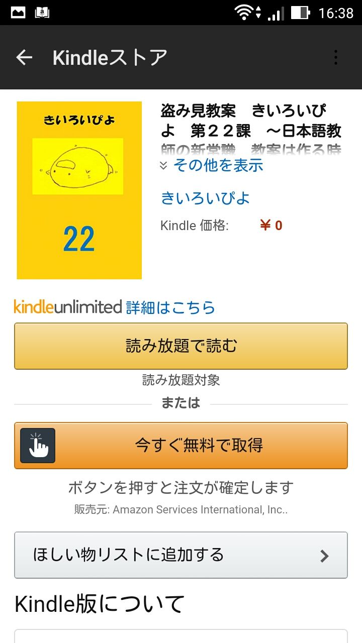 こんばんは、ぷっちんいちごです。 いちごの友達の「きいろいぴよ」さんが出版している「盗み見教案 きいろいぴよ」シリーズの内6冊が11月6日まで無料キャンペーン中ということで紹介したいと思います。 kindleやGoogleで「教案 きいろいぴよ」で検索することができます。 以下きいろいぴよさんの記事抜粋 本日から5日間(2016年11月2日~11月6日)、下記の私の教案計6冊を無料で提供させていただきます。 盗み見教案 きいろいぴよ 第5課 ~新米日本語教師のための教案です~ (教案集) 盗み見教案 きいろいぴよ 第7課 ~模擬授業もこれで乗り切る新米日本語教師のための教案~ 盗み見教案 きいろいぴよ 第12課 ~日本語教師のための教案の作り方はもういらない。これは教案そのものです~ (日本語教育) 盗み見教案 きいろいぴよ 第14課 ~初級の見せ場「て形」導入 新米日本語教師のための教案~ (日本語教師の教案) 盗み見教案 きいろいぴよ 第16課 ~教案は作るものではなく買う時代へ 新米日本語教師のための教案~ (日本語教師の教案) 盗み見教案 きいろいぴよ 第22課 ~日本語教師の新常識 教案は作る時代から買う時代へ~ (指導案) kindleやGoogleで「教案 きいろいぴよ ○○課」で検索すると出てきます。 お勧めは「縦」対応の22課ですが、無料なので6冊全部ゲットしていただけると嬉しいです。 kindleなんて持ってない!!って方も結構な確率でお手持ちのスマホにkindleアプリがインストールされていますのでご安心ください。 尚、kindleアプリのアイコンは添付画像を参照下さい。 見当たらない場合でも無料でダウンロードできます。 それではよい休日を きいろいぴよ ※抜粋終わり ぷっちんいちごでした。 ネットで買えば断然お得!お買い物なら楽天市場 かりすま日本語教師への道トップへ戻る