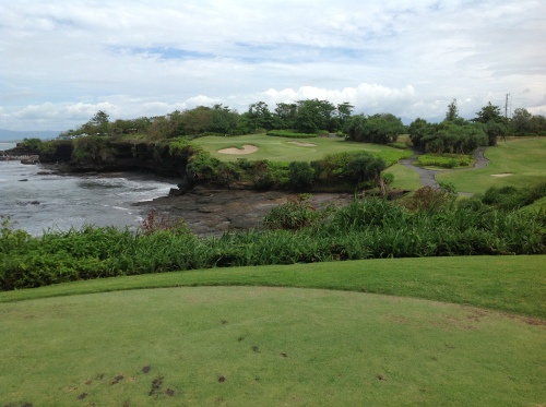 1月のバリ島は1ヶ月の内27日が雨と言われる雨季の中、滞在期間3日間快晴に恵まれました。 1.ニルワナゴルフ 滞在していたニッコーバリから車で焼く1時間半にあるバリ島で一番人気の ゴルフ場です。 コースは全体的にフラットで広いホールが多く、ティーショットで安心感を 与えてくれました。シーサイドホールのティーグラウンドに立つとコバルトブルー の海が広がり、景観の素晴らしさにプレー中である事を忘れてしまうくらい メンバー全員が見とれてしまいました。 (但し、グリーン奥はすぐ海なのでオーバー注意!) 料金は160万ルピア(約16,000円)+キャディーチップ10万ルピア (約1,000円)=170万ルピア(約17,000円)でした。 ホテルからの往復送迎バスと日本語が話せるガイド付きです。