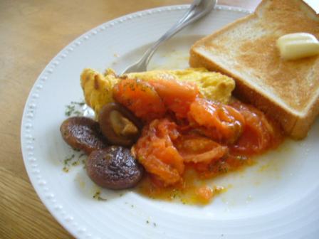こんにちは。今日の朝ごはんは 『トマトのオリーブ焼きとオムレツ』です。トマトも太陽の下でまっかに熟した季節が終わりになって 甘いトマトではなくなってきたのでオリーブ油で焼きました。あおくささが抜けておいしくできました。*ミオジャム*いちご*森の果実*こぐまのお気に入り