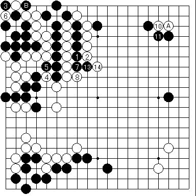 実戦図 実戦は、黒1から逃げ出しを劫立てに使いつつ3の所の劫争いが進行し、結局白Aに対して黒Bと解消して一段落となった。自分の囲碁人生で劫立てにシチョウを3本逃げ出したのは初めての経験だと思う。今後もあるかどうか。 劫立てでシチョウの逃げ出しというのは、ありそうで意外とない。「シチョウの逃げ出し7目損」と言われるように、ひどい損劫であること。また連打できても、シチョウ逃げ出し自体があまり大きい劫立てにはならないこと。などの理由で、実際に出現する機会が少ないのかも知れない。 この碁の場合、左上の劫が2段劫であったり、黒はそば劫でないと大石が全滅してしまうなどの条件が偶然重なって、シチョウの逃げ出しと追いかけが連続する極めて稀な碁になったのである。 白Bで、下辺の星に劫立てされたら受けようかと思っていたので、それだと4本逃げになったはずでちょっと残念。さてシチョウを解消した局面であるが、左上黒地がさすがに巨大過ぎて黒が優勢になったようだ。