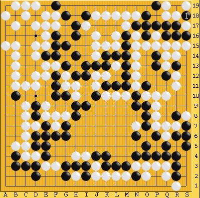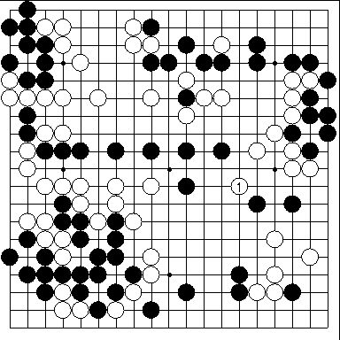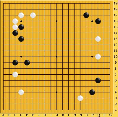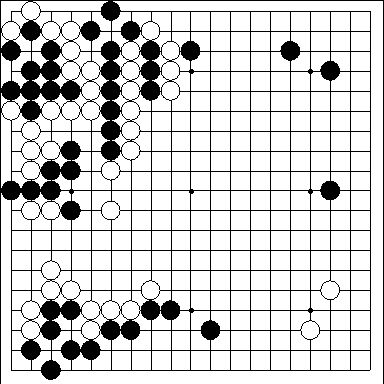 昨日はとっておきの絵画作品を展示したが、早くも反響があり、何とルーブル美術館から100万ユーロで譲ってほしいというメールがきた。想定内とはいえたいへん嬉しい。今後も面白い作品を展示していきたいと思う。 ところで、昨日の作品は終局図が面白かったので覚えていたのだが、改めて手順を追ってみてちょっと驚いた。何と、以下の図が昨日の碁の序盤である。この布石からあの終局図になるとは想像できない。 碁は変化するもの、とはよく言ったものである。作者さえも予想できないとんでもない変身をする絵画である。ルーブル美術館が目をつけたのもうなずける。 手順に興味がある方のために下に総譜を貼り付けておくが、素人のネットの早碁であり碁自体は鑑賞に堪え得るものではない。変化の不思議と終局図だけ楽しんでいただきたい。総譜