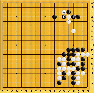 今日は、思いがけず素晴らしい体験をすることができた。日本棋院ネットのプロアマオープン戦、予選を通過して今日は一回戦。 組み合わせを見ると、どういう方かはわからないけれど韓国の人と当たることになっていた。昨日すでに行われた前半戦の成績を見ると、日本勢はほとんどやられていたので厳しいだろうなとは思っていた。 開始時間に対局室に入って一瞬気を失いそうになった。なんと、相手の韓国の人はプロの7段であった。厳しいを通り越した相手。しかし、気を取り直してパソコンに向かう。こんな打ち手に真剣勝負をしてもらえる機会などめったにないので、思い切りぶつかるのみである。 私の黒番。中盤までは意外なほど善戦できて、「もしかしたら奇跡が」と思う瞬間もあったがさすがに無理な話。終盤がっちりまとめられて盤面ジゴ。ハイライトシーンは以下。黒は薄く稼ぎまくっていて、白1と来られた場面。右側の黒を小さく取られるだけならまだ勝負だが、中央の黒に寄り付かれてしまい奇跡は起きず。