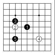 参考図1 上記のように2に飛ぶとどうなるか、検討した。参考図2 黒が白の間を一間に割っていくのは、下辺白2と打たれると右上を利かしても下辺の白石を取る手が見つからなかった。取れないと白勝ちになる。そこで黒は工夫が必要である。参考図3 参考図3の黒1につけていく手が面白いと思う。白2に引くと黒3にこすんで前回示した図に戻る。上下どちらかの白が持ちそうもない。参考図4参考図4A 白2の方に引くと黒3から決めて参考図4のように打てば、この後白が生きても黒が勝ちになる(参考図4A)。結局、参考図4の黒1とつけられると黒が勝ちになりそうだ。参考図5 上図のように、白12と打っても黒13と打たれてまずそう。不思議な事に、左上白がハネダシて利かした図からは、どうしても白勝ちの図を作れなかったのだ。参考図の間違いや白からのうまい手があれば、ぜひ指摘していただきたい。続く。