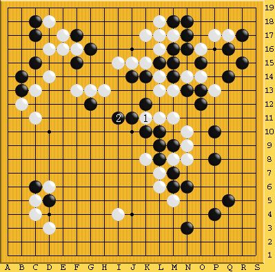前回の局面で、黒の次の一手は以下の2。この一手で上の2目取りと下の切りを同時に防いでいる(下の切りはシチョウ)。全く気づいていなかったので衝撃的な一手だった。 実戦は、このあと右辺の白の生きを見せながら手を伸ばしてから、以下のように封鎖した。攻め取りになって左辺が丸々白地となり、お互いに140目ほどの地の争いになり何と白に残ってしまった。