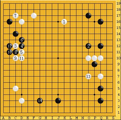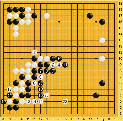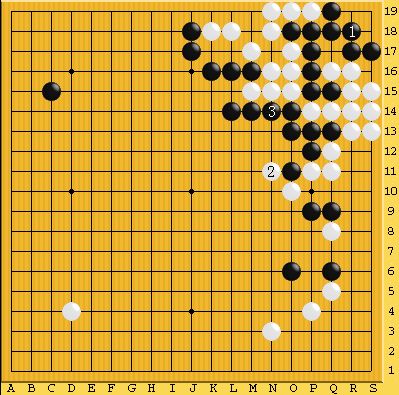 前回の局面で、実戦は以下のように進行し黒が上辺の白を取ってしまった。白2で、右上黒と攻めあいに行っても勝てない。1の所が急所で、黒1でいきなり上辺の白に詰めていくと白1と打たれて逆に攻め合い負けになる。 秒読みの中でさっとこの急所にいくのを見て、鍛え方が違うなあとため息が出たのである。