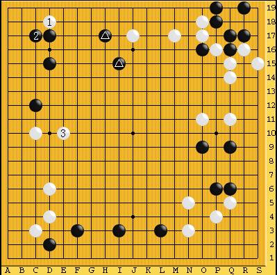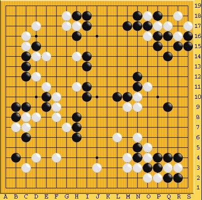 数ヶ月ぶりとなった今日の感動。強豪同士のネットの対戦から取材した。 以下の局面で白番。このまま無事終局すれば白に勝ち目は無さそうな形勢。 次の白の一手を見て、椅子から飛び上がり天井に頭を強打した。その前後の様子からして、おそらく黒の強豪も全く気づいてなかったはずである。 白の作戦は?