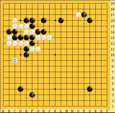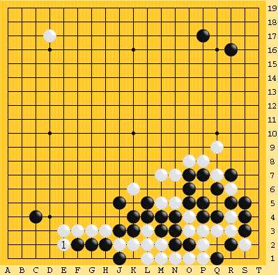 前回の局面で黒の1手は以下の1。 実戦図 この後、白が上辺の大石を取りに行くと左上でピッタリ2目で生きてしまう。白が左上の黒を取りに行くと、1手ヨセ劫になる。 この筋、果たして古今東西の詰め碁に類似の形があるのだろうか?まして実戦で生じたのは奇跡だと思う。さらに、短い持ち時間でこの手に気づいたのは神技だ。 白は今は中堅プロ棋士として活躍するTさん。直前の打ち方を見ると、この手には気づいていなかったようで、愕然としたに違いない。