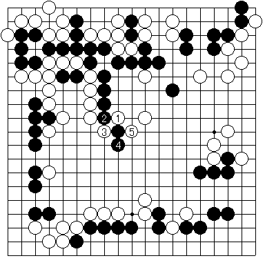 前日の 問題局面 で白はどう打ったでしょうか。何と白は、以下実戦図1のように、1から5と激しくやってきました。切った形も悪く、また左側の味が悪いので、普通は気づきにくい力強い手です。