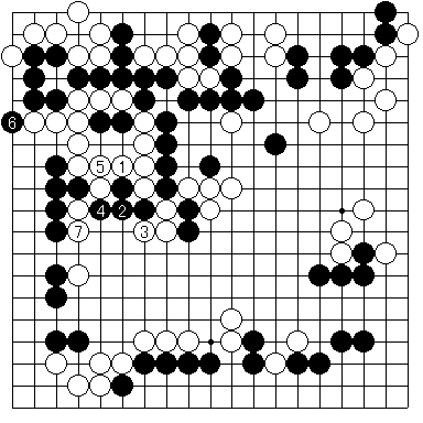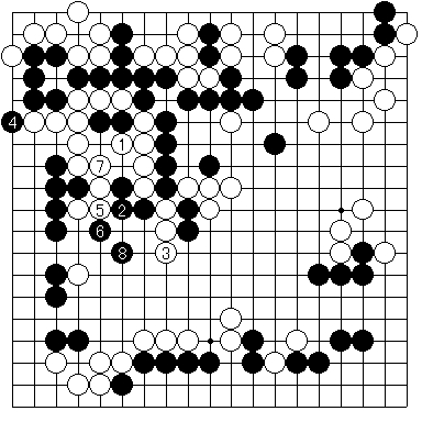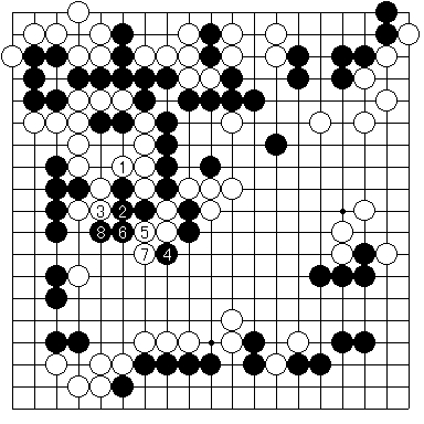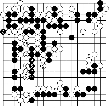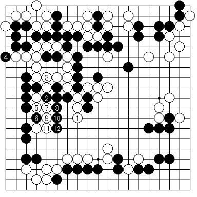 実戦図4 のように進行しました。最後に12と駄目をつめた手は強手ですが、この後正しく打てば実は黒が勝ちになるのでした。ここで、黒はどう打てばよいでしょうか?