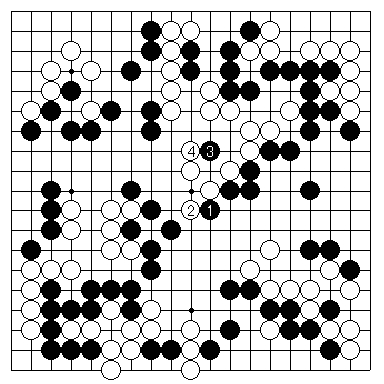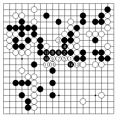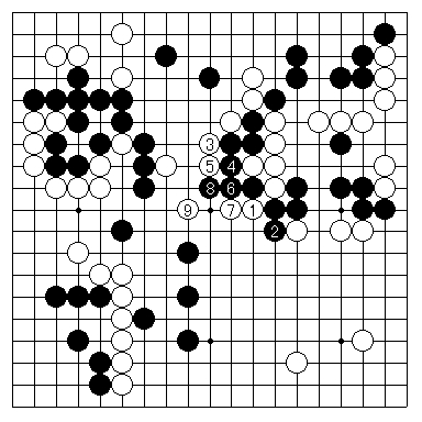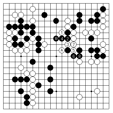 実戦図2 となって黒が取られてしまいました。5の方から追って下駄にいくのがミソで、うっかりしやすい筋です。黒の方もうっかりされたようです。