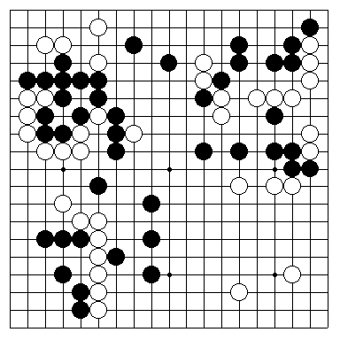 再び、羽根棋聖との昨年打った2子局から題材を取りました。黒が真中の白を攻めにいった場面です。下辺の白も目がはっきりせず、気になります。ここで、黒からどう打つべきでしょうか?私は、正解を打てませんでした。