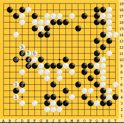 以下白 3 まで味をつけてから黒 4 から動き出した。黒 10 となっては中央の白一団も弱いので何かにはなりそう。