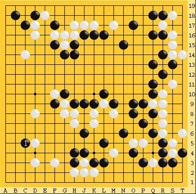 黒が私、白は力戦家でこのころ上位進出の常連だったMさん。序盤白が稼ぎ過ぎたようで、以下黒 1 となって黒リード。