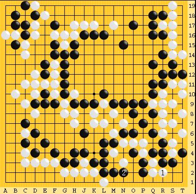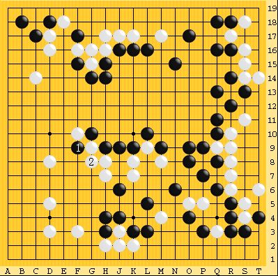 その後左辺は劫になったが、下図のように左下を蹂躙する分かれとなり黒勝勢となった。左上も劫になったが、この劫は譲っても黒が勝ちの形勢になっている。ところが、白 1 の劫立てに対し少し請けようとした黒 2 が大悪手だった。