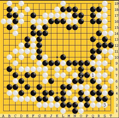 実は右下が手になっているのだが、お互いに気づかずヨセが続いた。以下白 1 がみすみすチャンスを逃す手で、中の方に手を入れれば手無しになる所だった。ところが、 1 目儲けようと黒 2 と受け白 3 でついにここが手になってしまった。実は、白 1 も不要で直接白 3 に打っていれば手になっている。どうしても、右下1線下がりと下辺1線下がりの両方が利いて、隅の白が生きてしまうのだ。何とも不思議な幕切れとなったが、お互い秒読みの中のドラマであった。