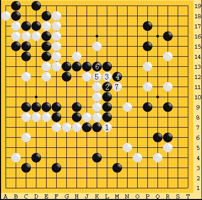 私の白番の碁。以下、白1に黒2が好手で左上が黒攻め合い勝ち。読み違いがあり悲観してしまったが、締め付けが利くので、まだまだこれからの碁だったようだ。