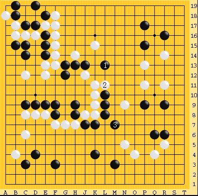 以下黒1に白2が大悪手で黒3と守られて息が切れてしまった。白2で3の左に切っていれば、黒があちこち薄くまだチャンスがあったようだ。この年、組み合わせに恵まれたが振り返るとどの碁も手が伸びずかなり内容が悪い。迷いが多かった時期だった。せっかくのTさんとの対局で不本意な内容になってしまったのが心残りだが、漫画のようには上手くいかないのが現実だ、