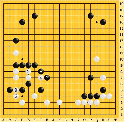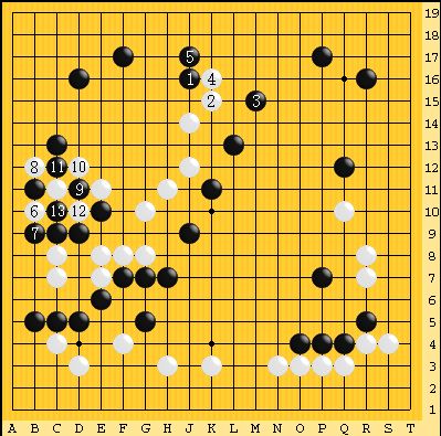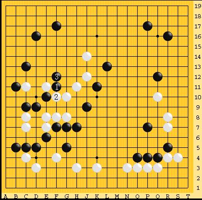 左辺に白から手をつけられ劫になった。結局ここの劫は黒が勝ったが、白の大石は逃げて右下方面の黒が取られる分かれとなり、白がリードした。Sさんは絶好調で、この時に初優勝した。