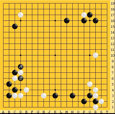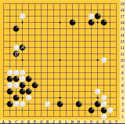 Lizzie の推奨は以下の A かB。柔軟な手だが、形としてはある手なので、全く考えなかったのは左辺を黒の構えにしなければと言う思いに囚われていたためだろう。   かつて酒井猛プロが、アマとプロの一番の差は柔軟性にあるというような事を書いていた。よく見かける形に囚われるだけでなく、「この石は攻めなければ」とか、「ここを地模様にしなければ」などの思いが生じた時に、局面が変化してもすぐ切り替えができない事が多い。AIには、さらにプロ以上の切り替えの早さを感じる。