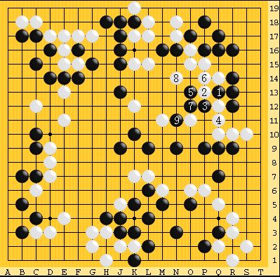 実戦は中盤まで黒がリードしていたが、上辺で失敗して微細な展開となった。以下黒 3 に白 4 が打ち過ぎでここが手になって黒勝ちとなった。白 4 7 なら、黒 4 先手から黒 5 と切り、白左側から当て黒 6 となり、微細な形勢が続いていた。