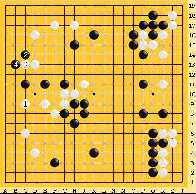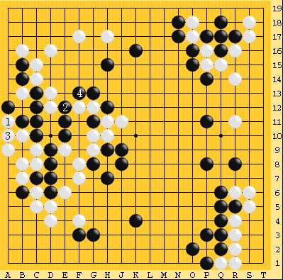 その後、左辺で劫争いになったが、黒が苦しかった。黒 2 に対し白は 4 に受けて下辺を劫材にすれば白が優勢だったが、白 3 と劫を解消して黒 4 と整形できて黒が優勢となり、その後もヨセで頑張り押し切った。