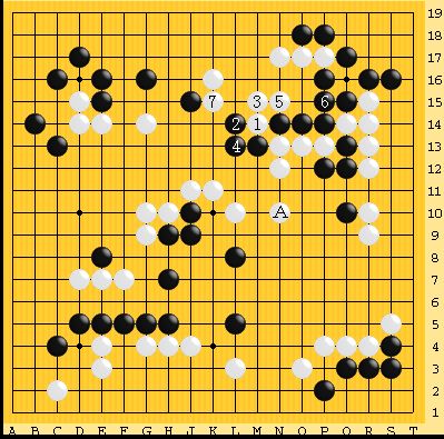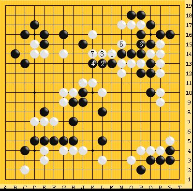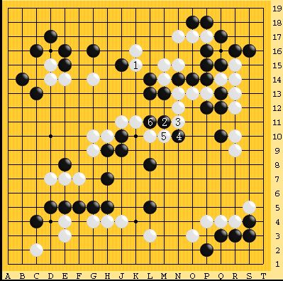 実戦は黒 2 から 4 が強烈。さらに 5 が手拍子で黒 6 でしびれてしまった。白 5 では 4 の右側に受けている相場だった。実戦は、右側黒石を取り中央白2子を取られる展開となり難しい碁となった。