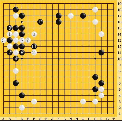 以下 11 までとなって白優勢となった。ただ、黒 10 が悪く、この手で■に打てば黒がやれたようだ。