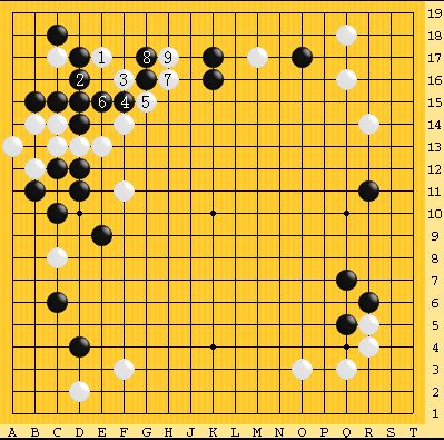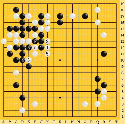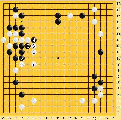 続いて以下のようになり、延々と戦いが続いた。上辺白は取られないので白悪くないが、白 4 ではもっとはっきりした手があった。