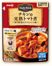 『Daily Rich(デイリーリッチ) 具だくさん調理ソース 4種4点セット』をモラう。 チキンの完熟トマト煮 鶏肉200gと白ワイン50mlを加えると具だくさんのトマト煮込みソースが出来上がる。 玉ねぎ、なす、ズッキーニ、赤パプリカ、しめじ、トマト入り。 チキンの粒マスタードクリーム煮 鶏肉200gと牛乳50mlを用意する。 生クリームとパルミジャーノチーズを使用し、たっぷりのマスタードとブラックオリーブを加えた、具だくさんのクリーム煮込みソースの出来上がり。 玉ねぎ、にんじん、じゃがいも、しめじ、ブラックオリーブ、粒マスタード入り。 エスニック風グリーンカレー たっぷりのココナッツミルクを使用した、マイルドでスパイス香る、絶妙な辛さに仕上げた具だくさんグリーンカレー。 玉ねぎ、にんじん、じゃがいも、なす、たけのこ、ヤングコーン入り。 後入れ具材は鶏肉200gと牛乳50ml。 北海道ポテト入りクリームグラタン 発酵バターを使用したベシャメルソースに、生クリームを加え、濃厚に仕上げた、具だくさんクリームグラタン。 じゃがいも、玉ねぎ入り。 後入れ具材は鶏肉100g、牛乳50mlチーズ50g。
