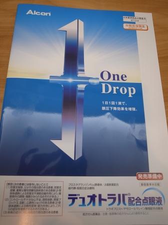 さて以前の日記でも書きましたが、近日中にPG製剤のトラボプロストとβブロッカーのチモロールの2剤が1瓶に入った「配合点眼液」である、デュオトラバが発売になります。先月には同系統のザラカムが先行発売になっていますので2番手での登場ということになります。 ようやくその新薬のパンフレットを戴きましたので早速見てみましょう。 パンフレットの表紙を触ってみると、立体的に作ってあってちょっとモコモコしています。 こういうパンフレットは制作費が非常に高いのです。製薬会社のこの新薬に賭ける気合・意気込みが伝わってきますね。 先行発売されたザラカムよりも、僅かですが眼圧下降効果が高そうなのと、 防腐剤に工夫を凝らして目への負担を軽減していること、の2点が魅力的です。発売が楽しみですね。 緑内障治療医としては、新しいお薬が増えることは大歓迎です。それだけ治療に当たっての手札が増えることになりますからね。もちろん新薬について十分に勉強を重ね、自らが万全の状態で実際の処方に臨めるようにこれからも努力を重ねて行きたいと思っています。