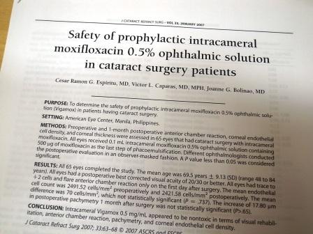さて大変勉強になった第34回眼科手術学会が終了して愛媛に戻った私は、学会場で聞いた「ベガモックス点眼液を白内障手術終了時に前房(目の中)に投与して安全性をみた論文がフィリピンの先生から出ている」という話を元にその論文を捜し求めました。 これがその論文です。それによると65人の患者様に白内障手術終了時に0.1mlのベガモックス点眼液を直接前房(目の中)に投与したが、視力・前房反応・角膜の厚さ・角膜内皮細胞密度(手術でダメージがあると減る)の点で非毒性(害がない)であったということでした。 しばらく前の日記でも書いたように、白内障手術後には500~2000例に1例の割合で眼内炎という感染症が発症し、最悪の場合には失明につながることもあることが知られています。またこの眼内炎は最近主流となっている角膜切開という手術法によって以前より増えてきているという報告も多くあります。 この怖い眼内炎を予防するために我々白内障手術医は以前から様々な工夫を凝らしてきたのですが、つい最近までは多数の論文解析で唯一効果があると判定されたのは「ポピドンヨード(いわゆるイソジン)による眼表面の消毒」のみでした。しかも、そのエビデンスレベルは「中等度の臨床的推奨(B)」に過ぎず、我々白内障手術医は、恐ろしい術後眼内炎に対してほとんど有効な対策を持てずにいた、というのが本当のところだったのです。白内障手術前後の抗菌剤の点眼、術後の抗菌剤内服、こういった現在の標準的な治療は眼内炎発症阻止には残念ながら無力だった、ということなのです。 こういった厳しい状況の中で、ヨーロッパから2006年に画期的な発表がありました。数千人規模での研究であったESCRS眼内炎研究班によると、白内障手術終了時に前房(目の玉の中)にセフロキシムという抗菌剤を投与すると、怖い怖い眼内炎の発症率が5分の1になった!というのです。 私も「そんなに安全なら是非自分もしたい!」と思いましたが、実は大きな問題がありました。というのはこのセフロキシムというのは本来は全身薬であり、眼に入れるためには煩雑な操作で濃度を調整する必要があるのです。調整に失敗すると中毒性前眼部症候群(TASS)という病態を発症する事もあり、そのため現在のところは日本ではあまり広まっていなかったのです。またこのセフロキシムは眼専用に作られた抗菌剤ではないので、その作用範囲があまり広くないなどの弱点もありました。 (続く)